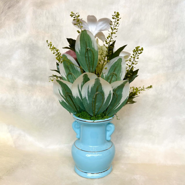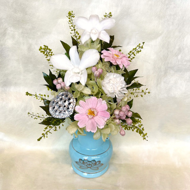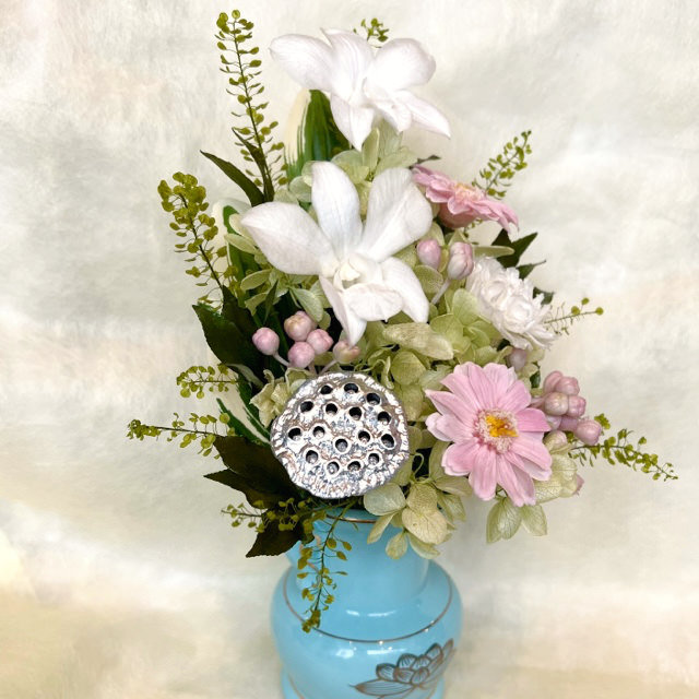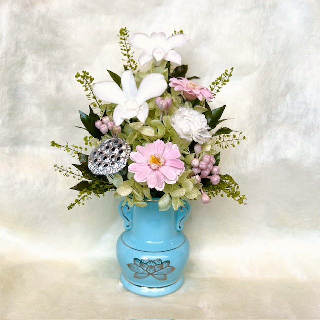 青磁色に金色の蓮華が描かれたお仏壇向きの花器に優しい花色で仏花アレンジを作ってみました。明るく可憐な仕上がりです。