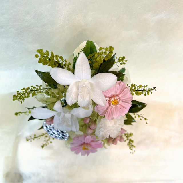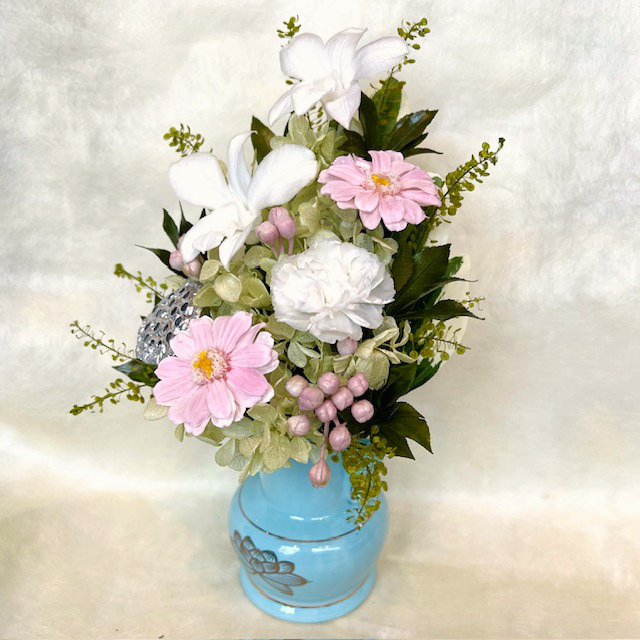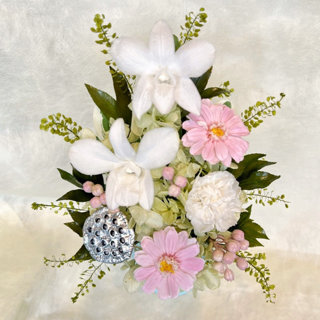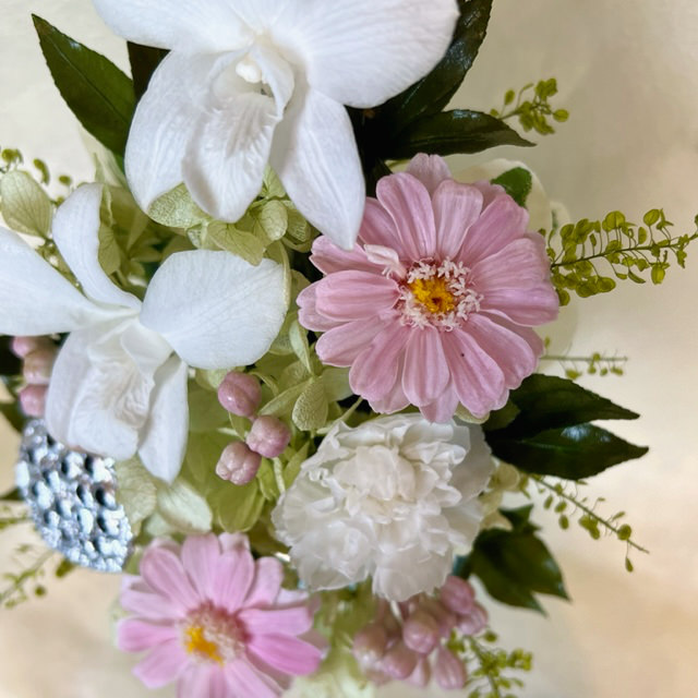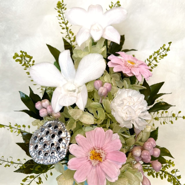 ●花材:プリザーブド(デンファレ・カーネーション・ジニア・アジサイ・リーフ)・アーティフィシャル(リーフ・ベリー)