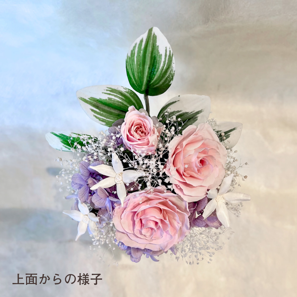 小さめの仏花とお花をたくさん使用してラウンドアレンジ(丸いアレンジ)に仕上げた、プリザーブドフラワーとソラフラワーのお仏壇用の枯れないお供え花(花瓶付き)です。花瓶付きで、開封時からそのままお仏壇へ飾れます。