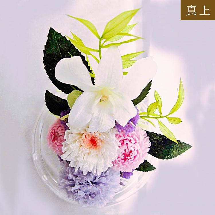 ②お仏壇のお供えにぴったりな、淡桃(あわもも)色のデンファレと小菊の枯れない仏花のアレンジ『祈り』です。品の良い白いデンファレと淡い色の花で、清潔感のあるデザインですから、清楚だった故人へのギフトとしてどうぞ。