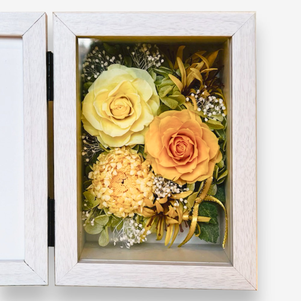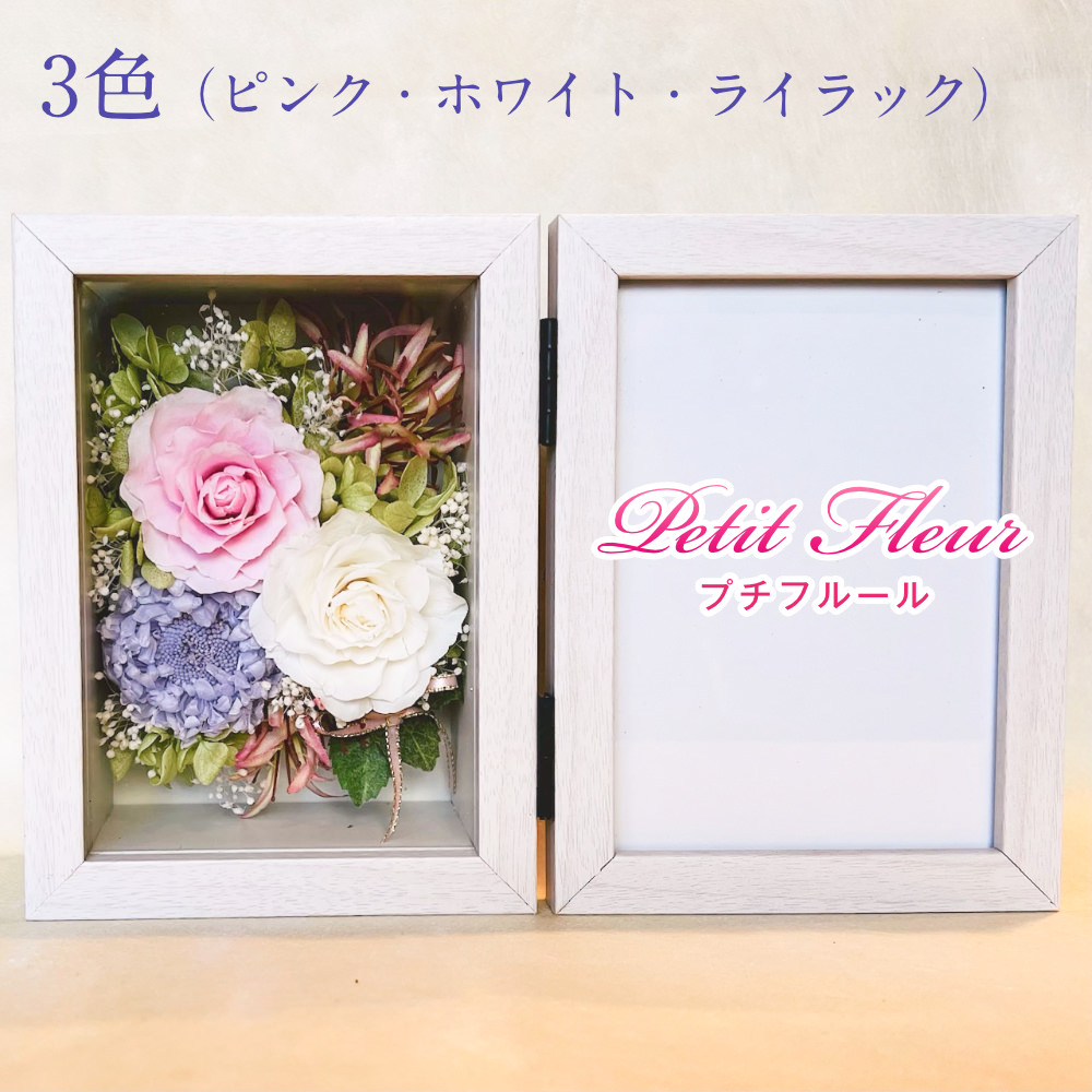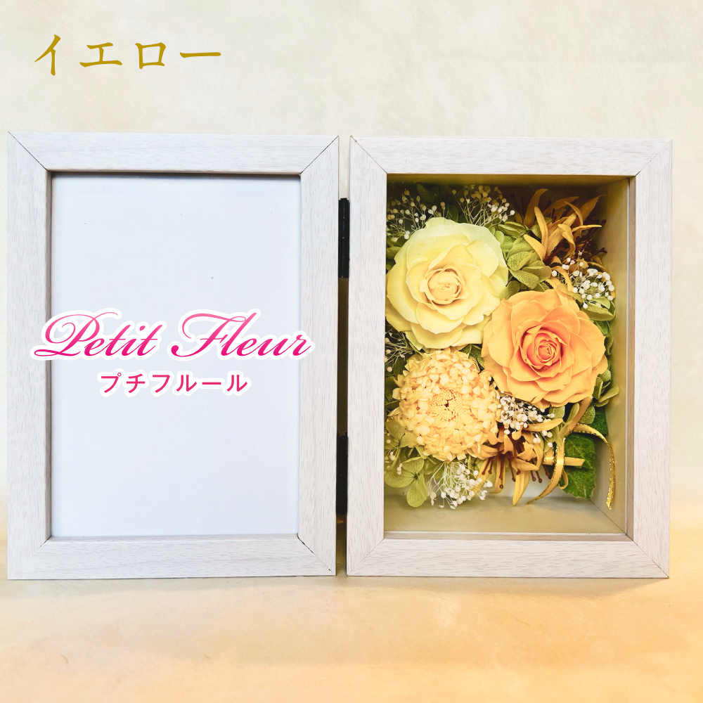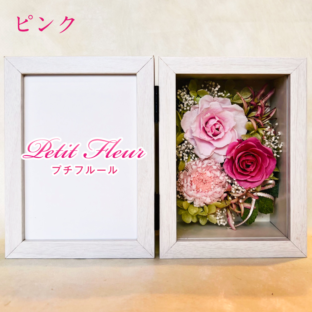枯れないお花を木製のフォトフレームに入れた贅沢なアレンジ『プチフルール』。フォトフレームの片側に小花を詰めた可愛らしいアイテムです。