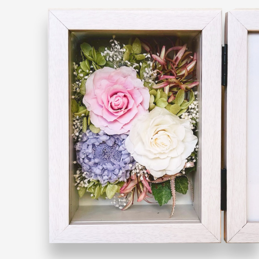 【枯れない花・お祝い花】バラ・あじさいのプリザーブドフラワーが詰まったフォトフレーム